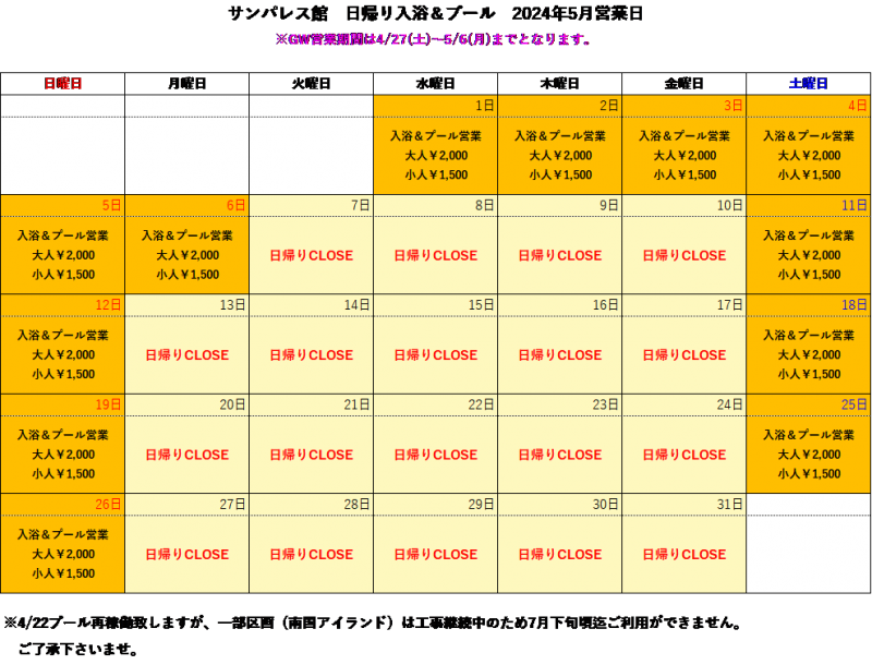 The one-day bathing hours for May 2024 are as shown in the table above.