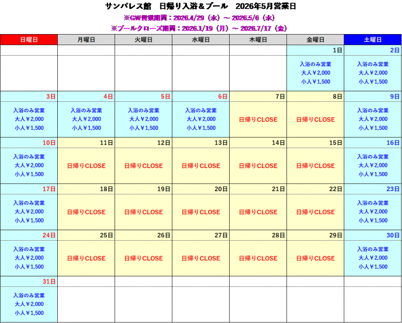2026年4月、5月の日帰り入浴は下記の通りです。