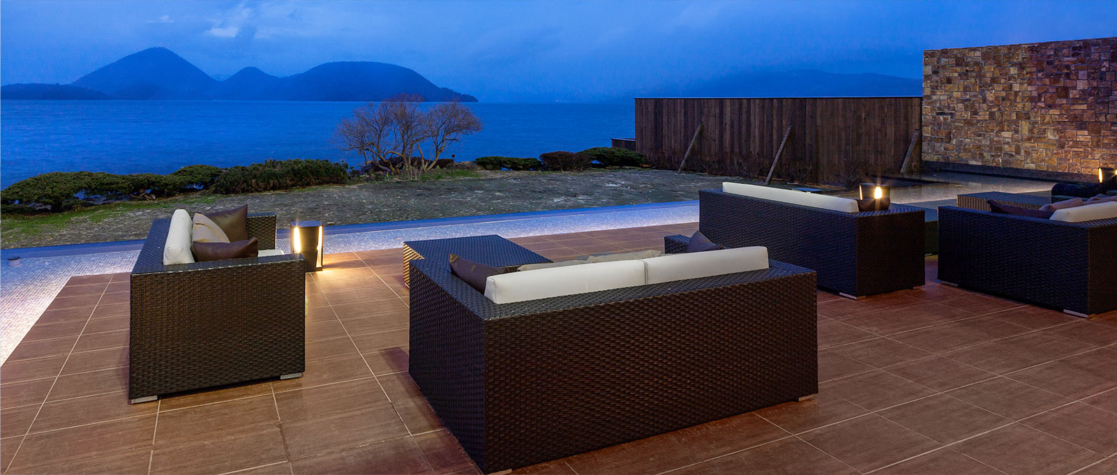 冷たいお飲み物をご用意したラウンジには、ほてった体をそよ風が優しく包んでくれるテラスも隣接しております。流れる水のせせらぎをBGMに、雄大な洞爺湖を望める人気の癒やしスポットとなっております。